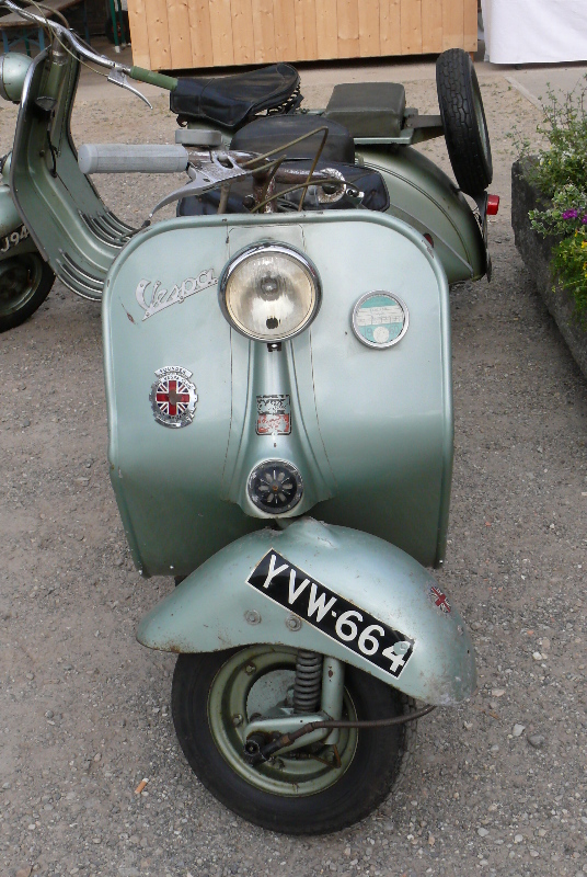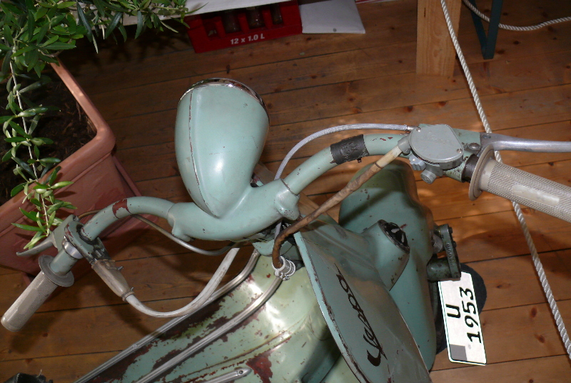 Dieses Treffen ist zwar eher kuttenfrei, es spielte abends ein Trio Schlager der 50er statt Northern Soul und das Durchschnittsalter geht schon stark Richtung 60, aber dafür ist es äußerst liebevoll geplant. Neben handgefertigter Deko am und im ganzen Huberhof gab es ein kleines „Rollermuseum“, in dem Kaffee und diverse Kuchen zu haben waren, an Händlern waren der Rollerladen, Peter Erhorn, Scooterpezzi und ein Italiener namens „Legend Bikes“ vertreten und an Fahrzeugen waren eher wenig PXen, dafür umso mehr Oldies vor 1970 vertreten.
