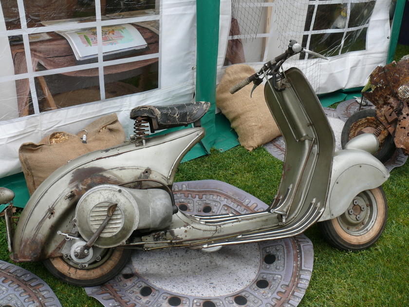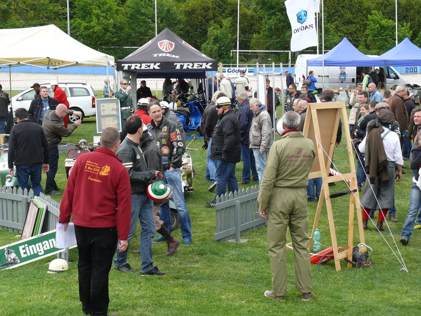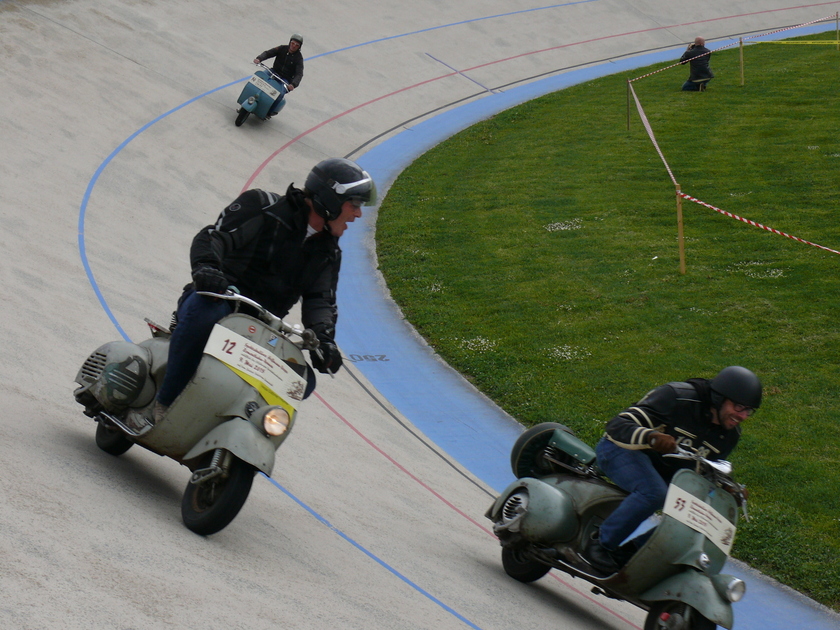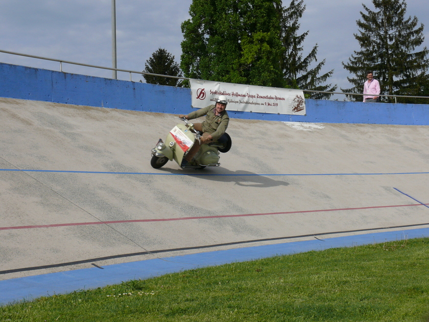 Im Mai 2015 wollte ich es wissen und bin auf eigener Achse mit der ACMA V52 und guten 60 km/h die rund 230 km nach Darmstadt zum Hoffmann-Treffen auf einer historischen Zementrennbahn gefahren. Wenn man sich die Zeit nimmt, ist so eine Strecke auch als "Wanderdüne" zu bewältigen und macht Spaß. Und ich war sicher einer der wenigen, die nicht mit dem Roller auf dem Anhänger angereist sind... Ich hatte mich (leider) nicht zum Rennen selbst gemeldet, der Skrupel, andere auf der Bahn mit meinem Tempo zu blockieren, war zu groß. Vor Ort waren natürlich viele Leute, die man in der Szene kennt: Peter Witzel, Robin Davy, Ralph Bollag, Andreas Nagy, Matthias Hochberger, Thomas Knickmeier, Leo Macaluso, Pasquale del Sorbo, Rita Fauerbach, Andreas Gattwinkel und viele mehr. Der Horst Klaus aus Lichtenfels war auch da, so dass ich auch jemanden hatte, den ich ganz gut kenne. Die Rennen in mehreren Klassen waren beeindruckend, vor allem die beiden Steilkurven. Am Sonntag bin ich dann nach den Rennen doch noch selbst auf die Bahn und hab auch ein paar Runden gedreht. Auf der Heimfahrt war dann der Wurm drin - erst rappelte sich der Hauptständer los, dann ca. 100 km vor Nürnberg hatte die Kiste einen Klemmer, warum auch immer. Dave und Thermo waren dann so nett, mich abzuholen.